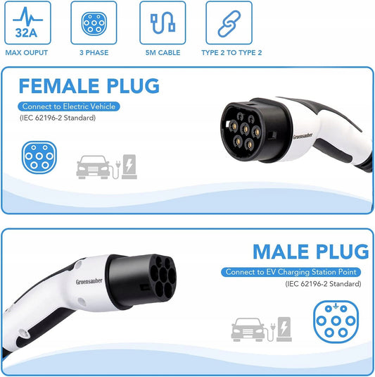 Kabel do ładowania EV typu 2 do typu 2, 3 fazy, 32 A, 22 kW, 7 m